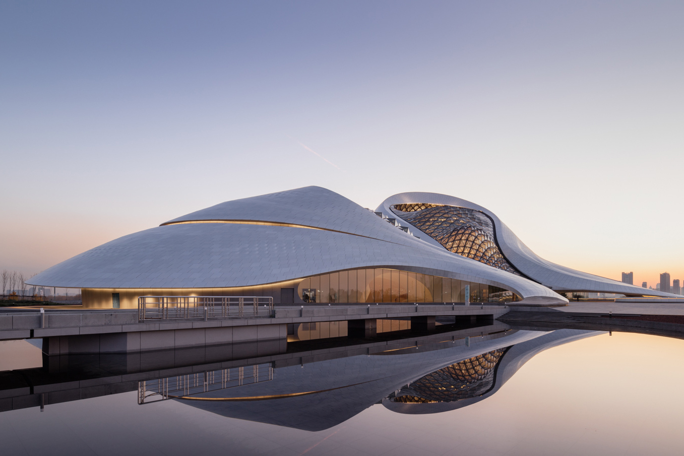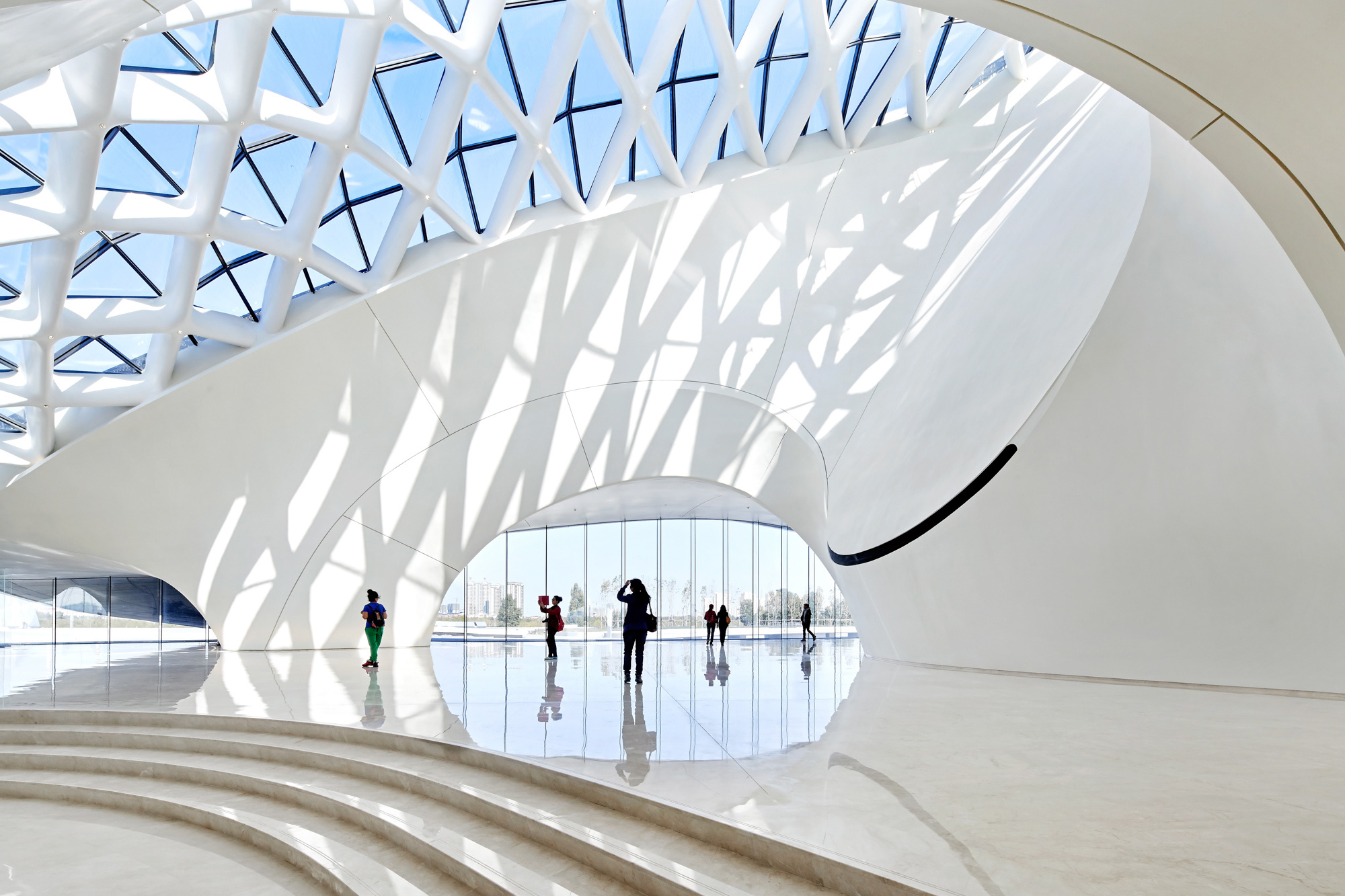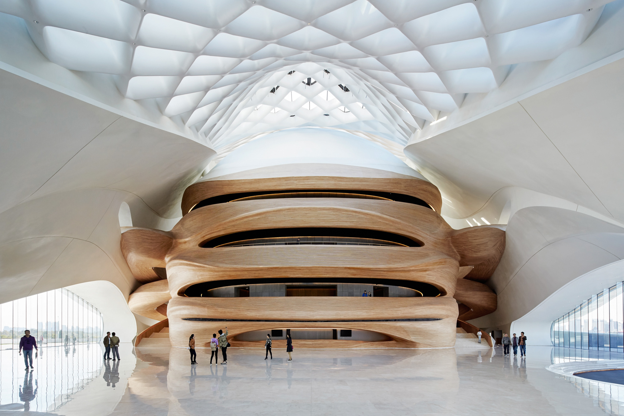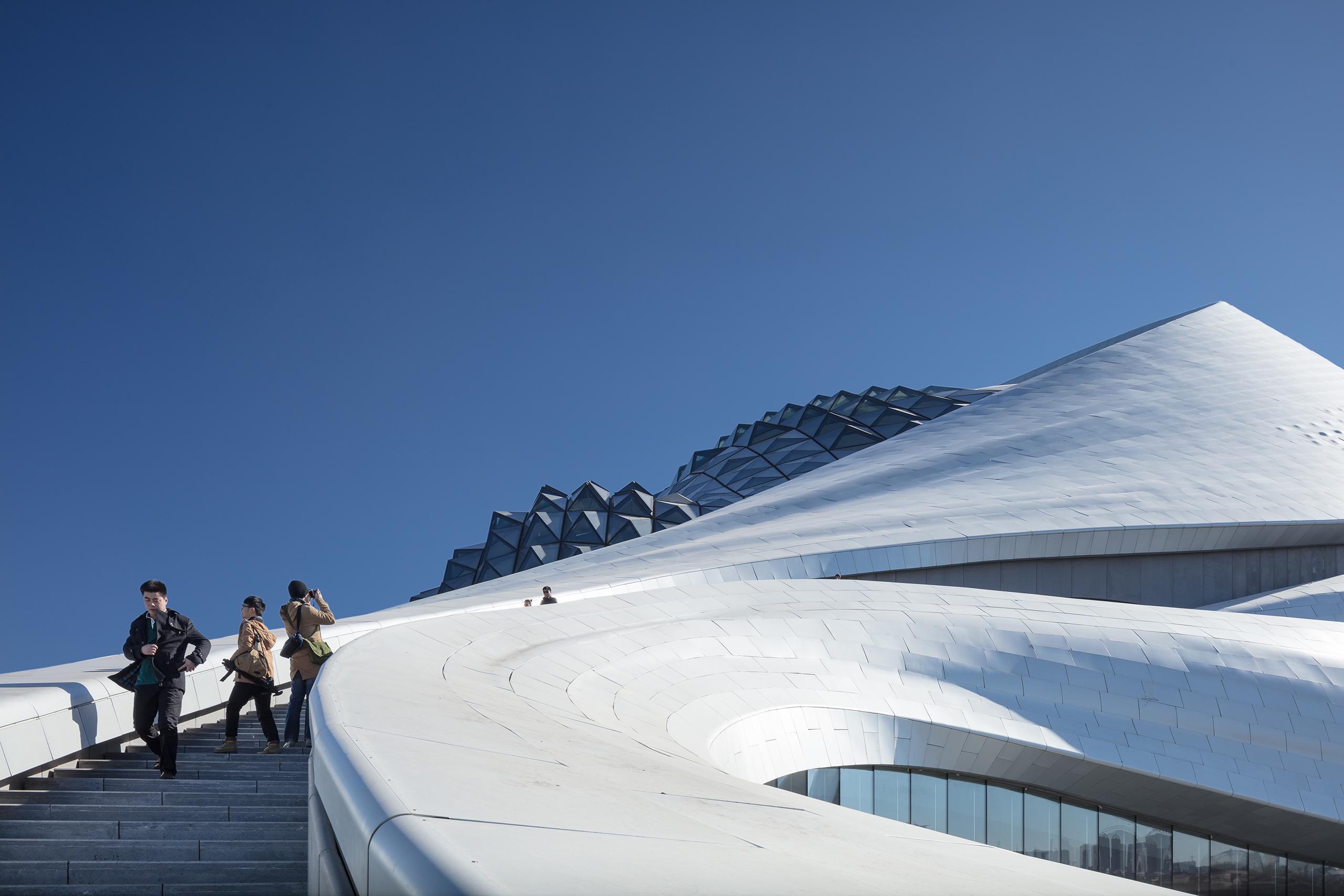 Fuori dalle sale, i foyers, illuminati quasi interamente da luce naturale, sono coperti da un soffitto a losanghe vetrato dove si alternano superfici lisce e sfaccettate, un riferimento alla neve e al ghiaccio del gelido clima siberiano. Tra l’altro, non lontano dal teatro si trova il più grande parco naturale di tigri siberiane al mondo, che costituisce un’altra attrazione per i turisti che vogliono visitare Harbin e conoscere la sua intima relazione con il rigido clima che la caratterizza.