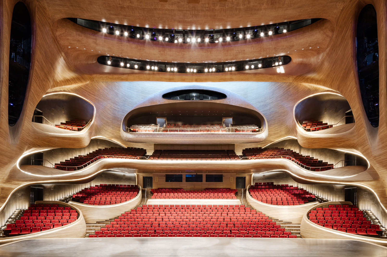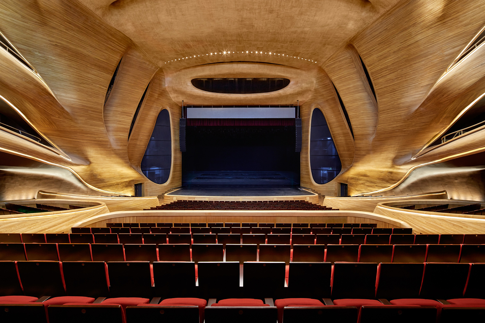 La sala principale può ospitare circa 1500 spettatori ed è interamente rivestita in frassino di Manciuria, che riveste la struttura in acciaio dell’ambiente dalla classica forma a ferro di cavallo, dagli elevatissimi standard acustici.