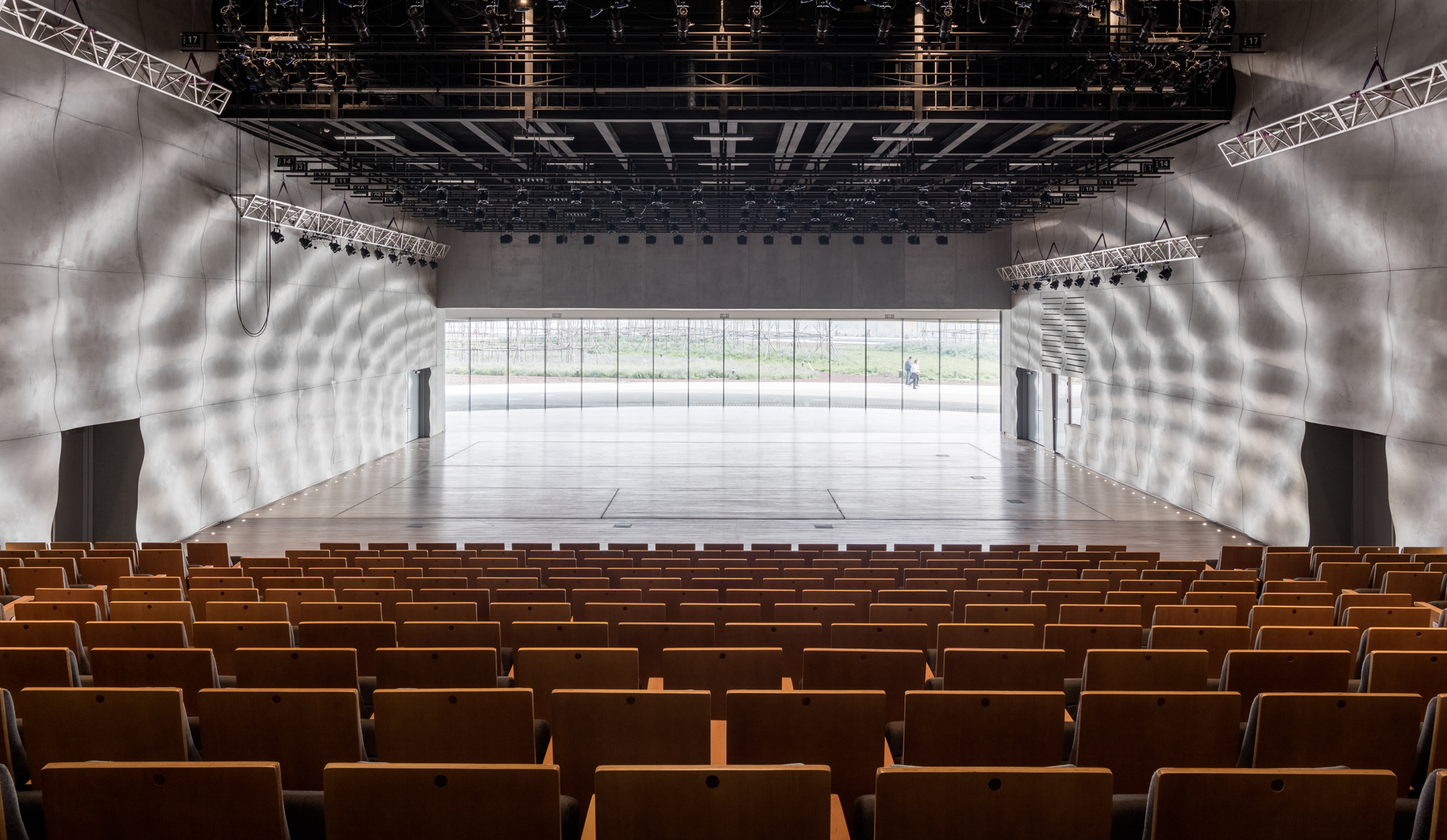 Un’altra sala più piccola, da circa 400 posti, viene utilizzata principalmente per teatro in prosa e musica da camera, ma anche eventi di altro genere, costituendosi come sala multifunzionale. Alle spalle del palco, una parete interamente vetrata separa il pubblico e i performer dall’esterno, permettendo di utilizzare l’ambiente circostante come scena, altro aspetto che sottolinea l’importanza della connessione tra edificio e ambiente per lo studio MAD.