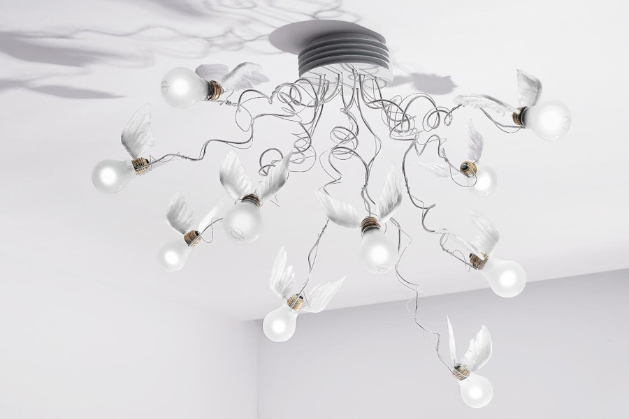 E magari, perché no, in voli di coppia e non più soli, come suggerisce Lucellino Doppio, versione con due lampadine della prima iconica lampada. Così tutte queste delicate ed eleganti lampadine piumate continuano a volare sui muri, illuminando libere e senza ostacoli le case di chi ha la fortuna di ospitarne qualcuno.