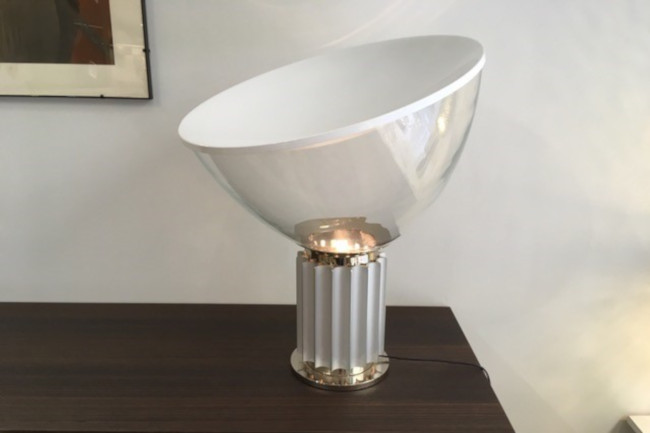 Nella base è stata nascosta la lampada che invia il fascio luminoso sul disco in alluminio e per effetto della rifrazione la luce viene diffusa nell’ambiente senza disturbare gli occhi. La luce riflessa della Taccia è una luce stupenda e molto coinvolgente, che non reca nessun tipo di fastidio. Il successo di questa lampada non è solo intrinseco nei materiali e nel sistema di diffusione, ma soprattutto per il suo design senza tempo, lo stesso Castiglioni disse: “è la Mercedes delle lampade, un simbolo di successo”.