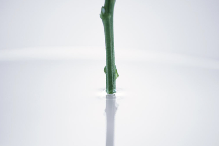 Immaginate un vaso Puddle su un tavolo di legno, illuminato dalla luce del mattino che si riflette nell’acqua traslucida. Lo stelo della pianta sembra galleggiare, sospeso in un fragile equilibrio che richiama la perfezione imperfetta della natura stessa.