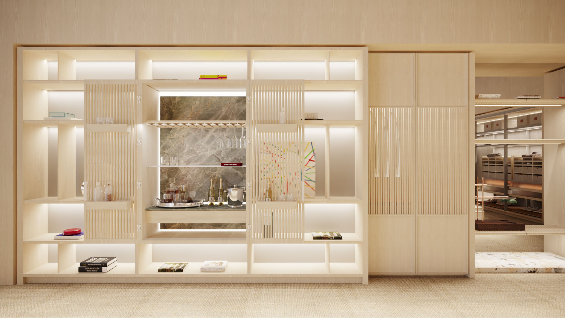 Timeless Bar, con la sua struttura robusta e i divisori leggeri, si impone come un elemento distintivo nell’ambiente. La sua ricchezza di dettagli si manifesta nelle varie finiture e texture, che permettono molteplici combinazioni, e nell’illuminazione automatizzata e regolabile. Scomparti, porte, cassetti e sezioni bar offrono soluzioni versatili per diversi spazi, consentendo una configurazione e un utilizzo altamente personalizzabili.