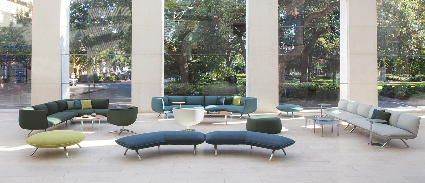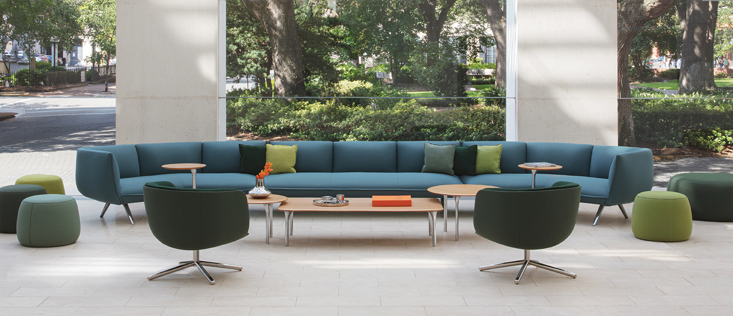 La collezione Luca comprende 41 pezzi intercambiabili – tra cui divani, divanetti, chaise, panche, angoli, sedute con tavolini, una famiglia di tavoli compagne, pouf e panche autoportanti – che possono formare una serie infinita di configurazioni. C’è una scelta di rivestimento in qualsiasi alternativa Bernhardt Textiles, con gambe disponibili in alluminio lucidato nero opaco o bianco satinato. I tavoli vanno dal tavolino da caffè fino ai tavoli per laptop in cinque diverse altezze con scelte di piano di appoggio tondo, ovale, rettangolo o quadrato e finitura in noce, laminato o Corian.