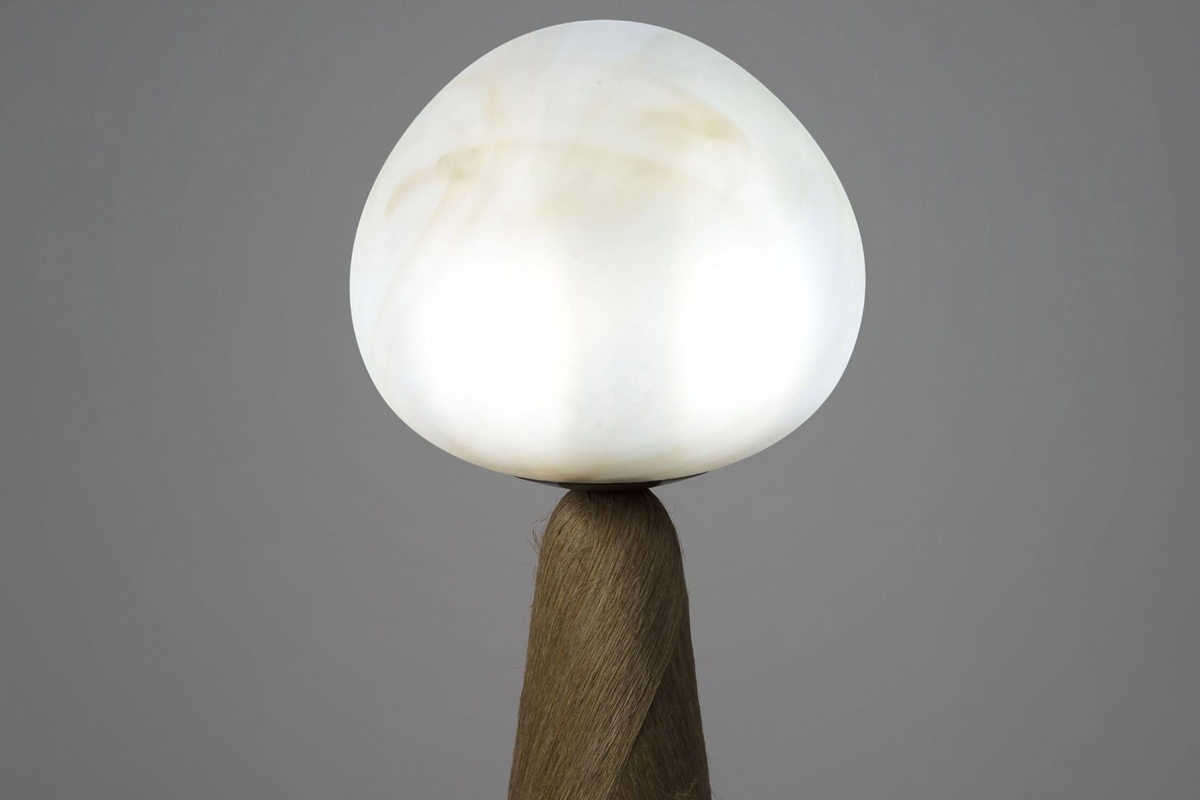 La sfera è stata realizzata da un vetraio mediante la tecnica del vetro soffiato. Questa tecnica permette di avere striature varie e selvagge quando la lampada emana la sua luce. La base è tornita da un ebanista e lo studio di Constance Guisset ha applicato a mano il lino; esistono due versioni della lampada in base al colore del tessuto: naturale o nero.