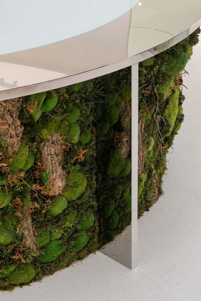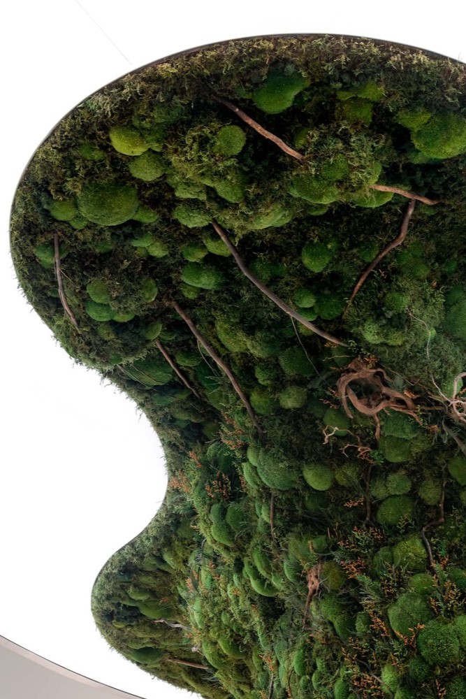 Per questo, il punto focale del negozio è un’enorme scultura a forma di albero rivestita di muschio stabilizzato e che si protende verso il sole, il disco luminoso a cui l’installazione è sospesa.