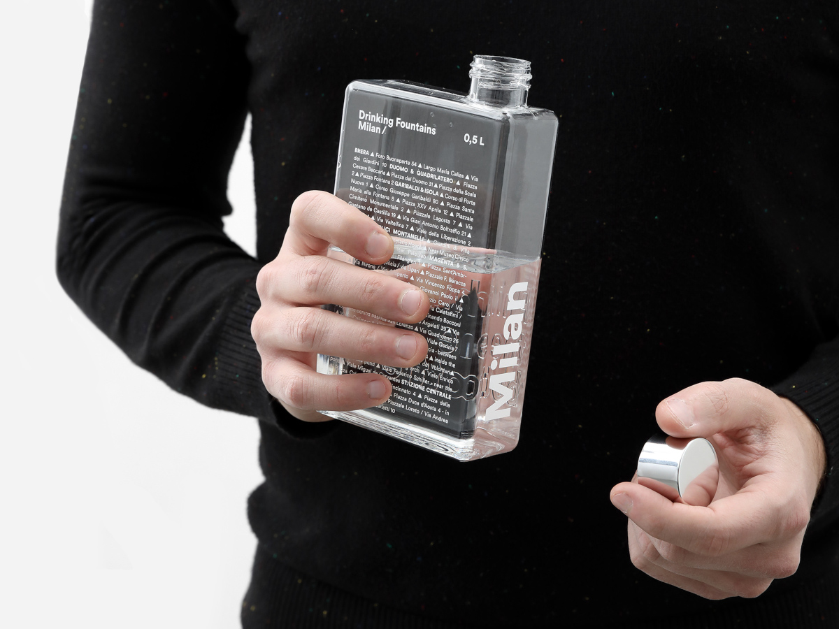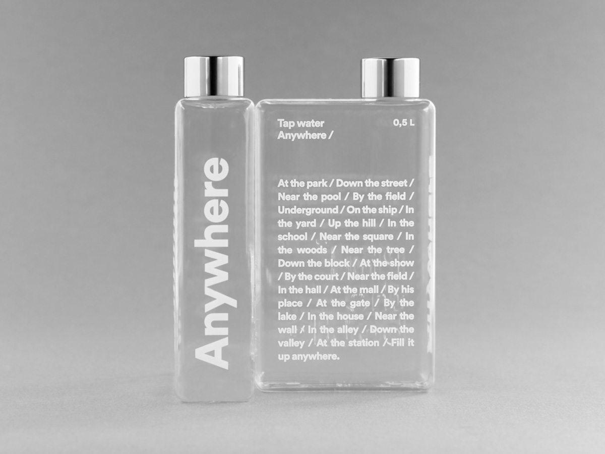Il design è molto semplice ma efficace ed elegante. Un parallelepipedo trasparente con tappo in alluminio e scritte bianche. Su un lato il nome della città scelta (Anywhere per i più indecisi) e dietro la lista delle fontane urbane.