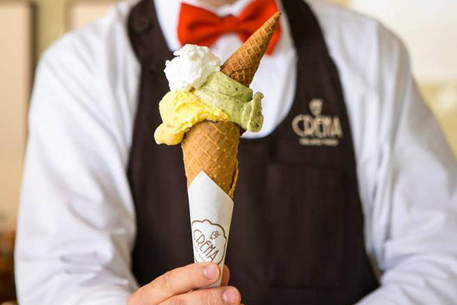 Nata nel 2020 dall’incontro tra l’iconico marchio di moda Bulgari e il maestro della gelateria d’autore Claudio Torcè, Crema Alta Gelateria ci accoglie oggi immersa in un’atmosfera al contempo raffinata e dai toni caldi, resa tale proprio grazie alla presenza di elementi quali il legno di mogano, l’ottone e le antiche zuccheriere che ci fanno tornare con un solo sguardo ai caffè e alle cremerie storiche. Ma è con una vetrina di oltre 50 gusti che vuole raccontarci la sua storia e i suoi stili di gelato, premiato per due anni di fila con gli iconici 3 coni da Gambero Rosso.