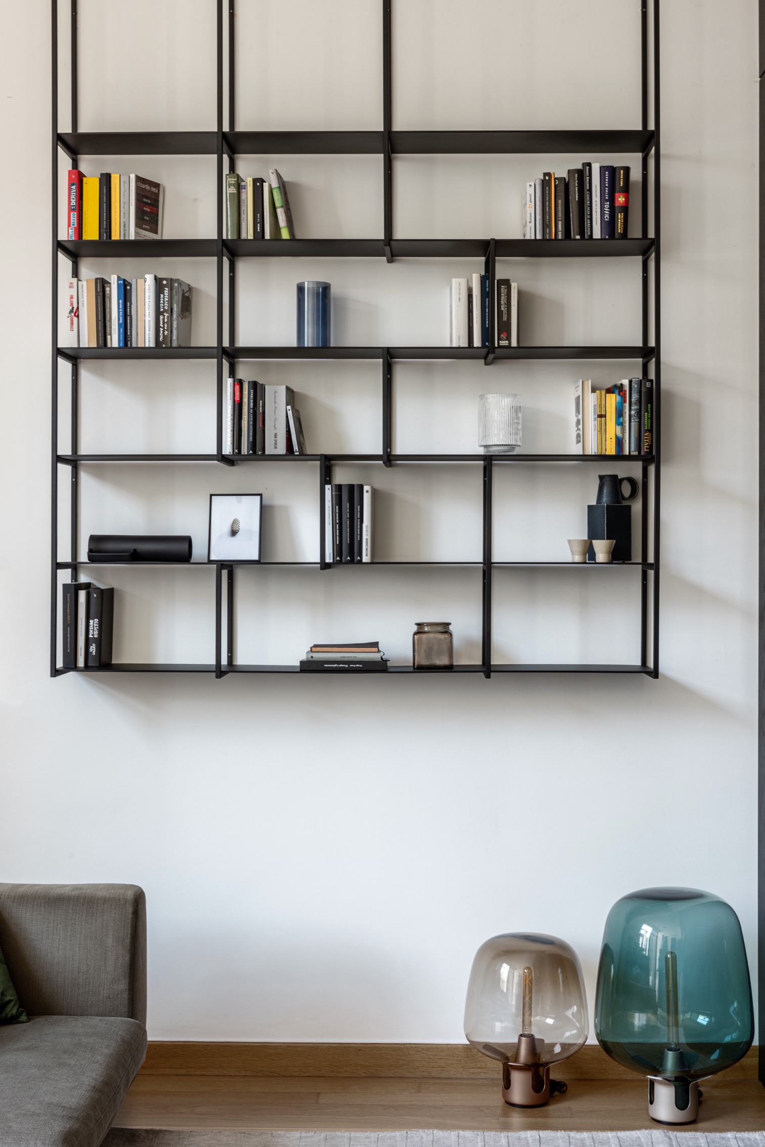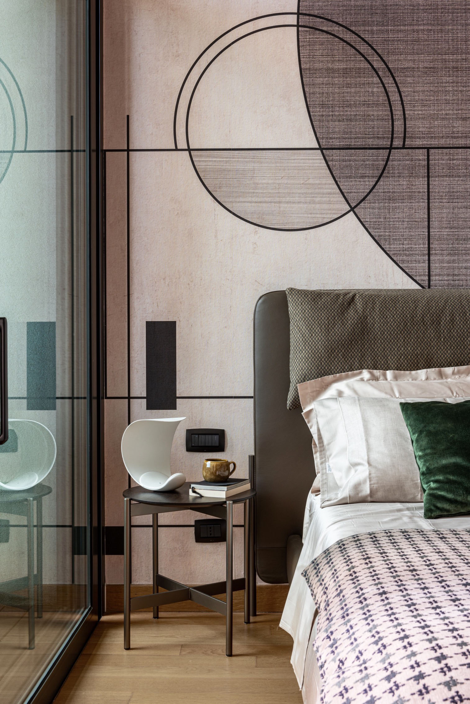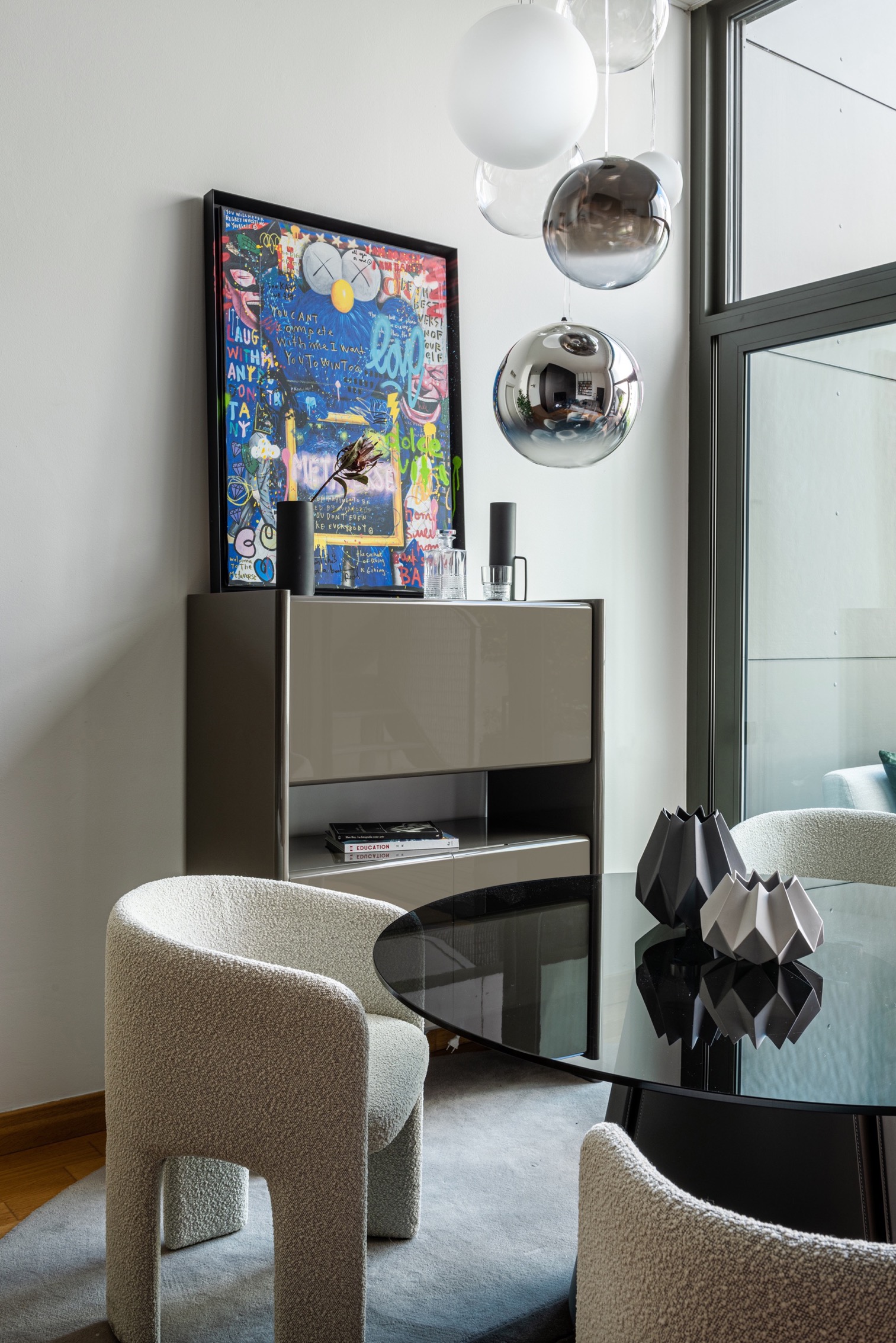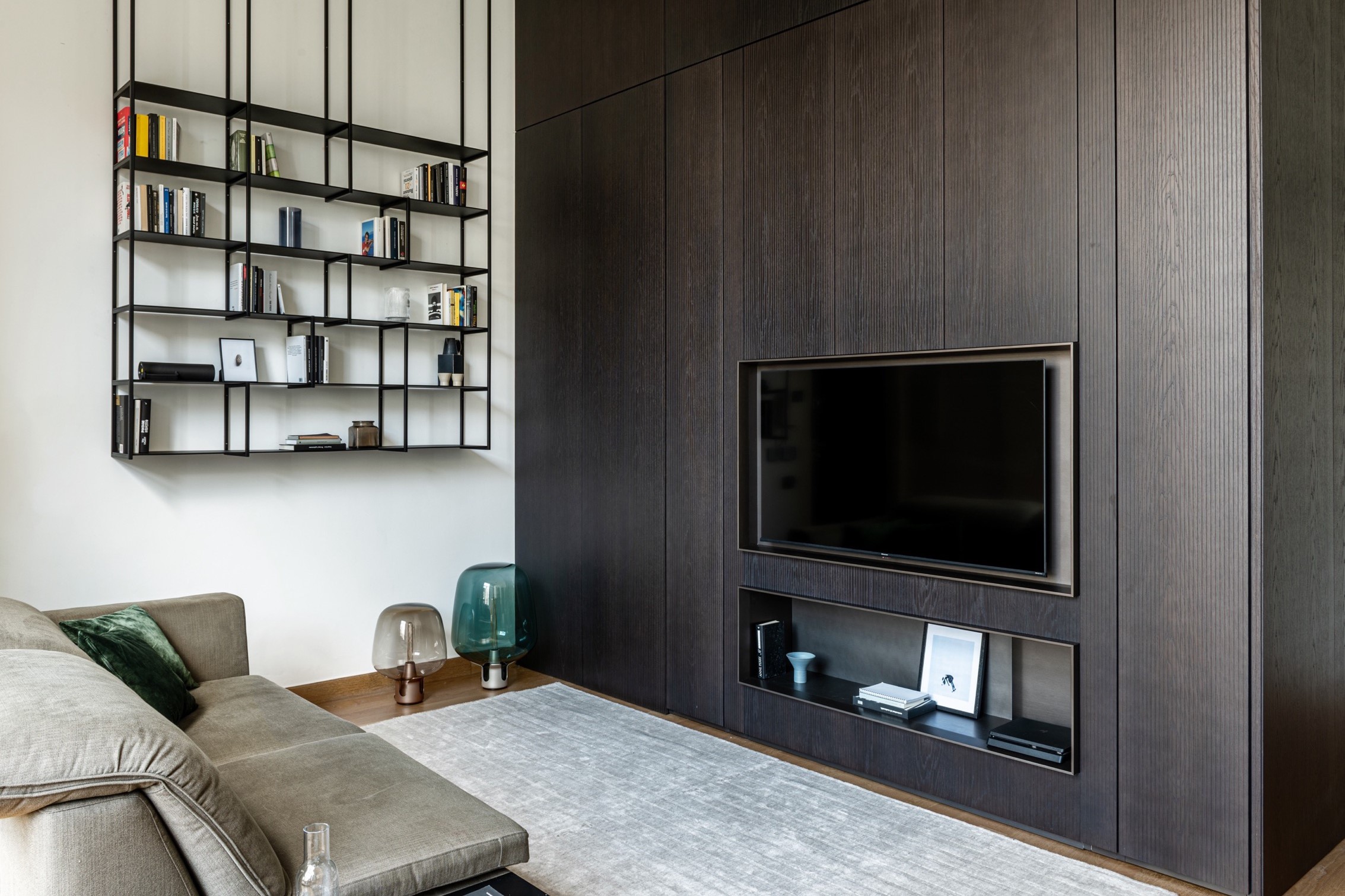 Nel progetto di Parco Vittoria, Matteo Lualdi ha giocato con il contrasto tra gli ambienti luminosi e neutri dell’appartamento e i toni scuri e di carattere dell’arredo. Nella zona living, la boiserie in legno a tutta altezza di Olivieri, disegnata da LualdiMeraldi Studio, ha la funzione di contenitore e parete TV e allo stesso tempo nasconde una porta. Sempre su disegno di LualdiMeraldi Studio, la libreria minimale in metallo è un prodotto realizzato su misura da Mo.1950, mentre il mobile bar Cosmo che ricorda gli interni degli anni ’80 è di Olivieri. Il tavolo Claire è prodotto da Ditre Italia e le lampade, a sospensione e da terra, scelte per creare un’atmosfera accogliente e conviviale, sono dell’azienda Lodes, la cucina è un progetto su misura di Cesar.