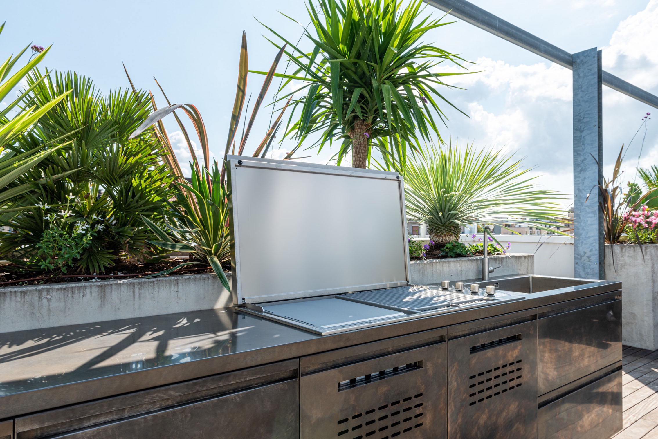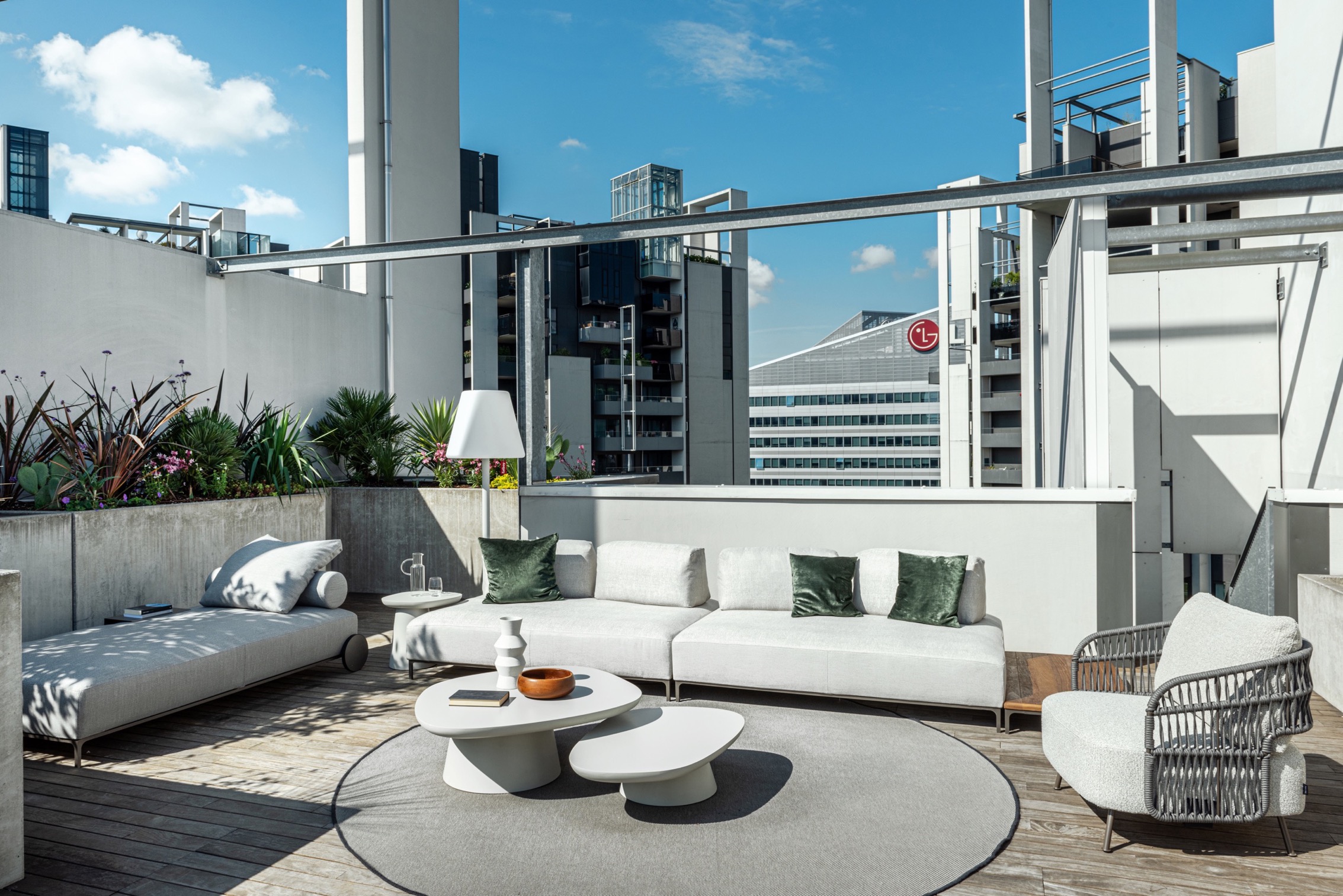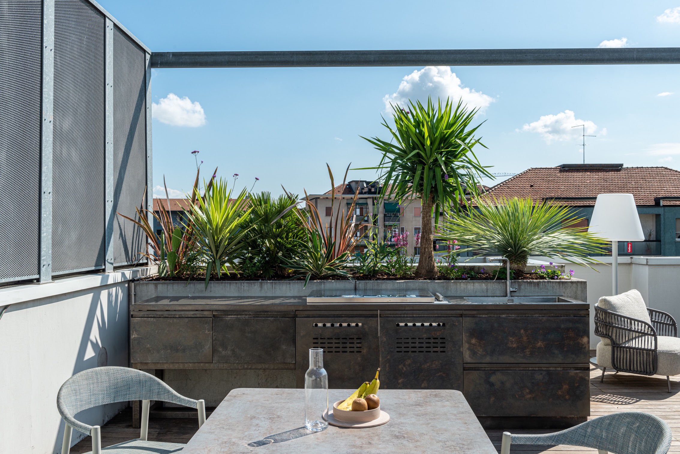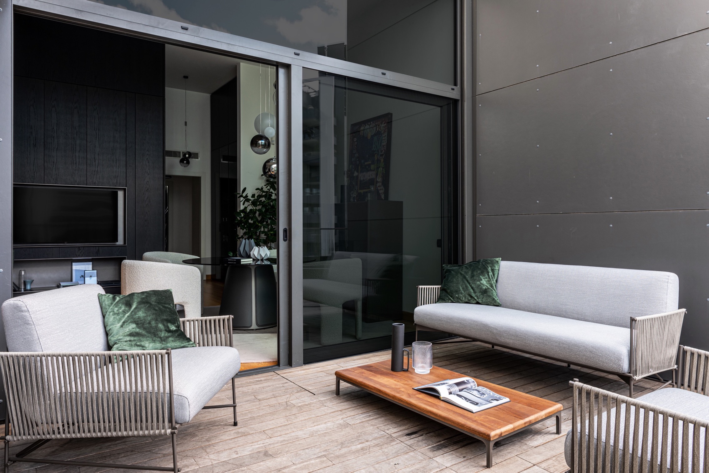 La qualità del progetto si manifesta anche negli ampi spazi esterni: un primo terrazzo al piano di 25 mq collegato alla zona living attraverso una grande vetrata ingrandisce lo spazio che si percepisce come un tutt’uno, anche grazie all’arredo di Ditre Italia che riprende colori e finiture utilizzati all’interno dell’appartamento. Da questa prima terrazza si accede al secondo spazio esterno attraverso una scala e in entrambi gli ambienti non si rinuncia alla ricercatezza dei dettagli con il progetto del verde a cura dello studio Lai Valenti e alla scelta delle lampade di Fatboy.