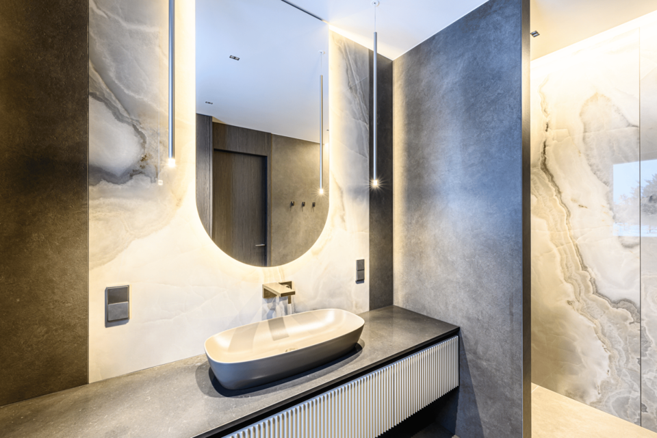The client’s brief was succinct yet profound: a harmonious fusion of luxury and nature. Ako In meticulously curated every aspect of Milena House to embody this ethos. From the sprawling windows framing serene forest views, where deer occasionally grace breakfast-time vistas, to the heart of the home—a magnificent two-sided fireplace adorned with Luxury Black Fusion granite and wood panels—every detail exudes sophistication and tranquility.