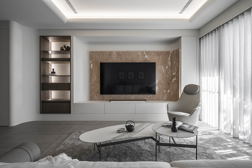 Arched designs weave a cohesive narrative throughout the residence. Rounded facades and wall details enhance the flow of the space. Rounded edges on the faux ceilings cleverly conceal various structures and equipment, while beautifully designed arcs embellish the living room beams, adding visual depth.