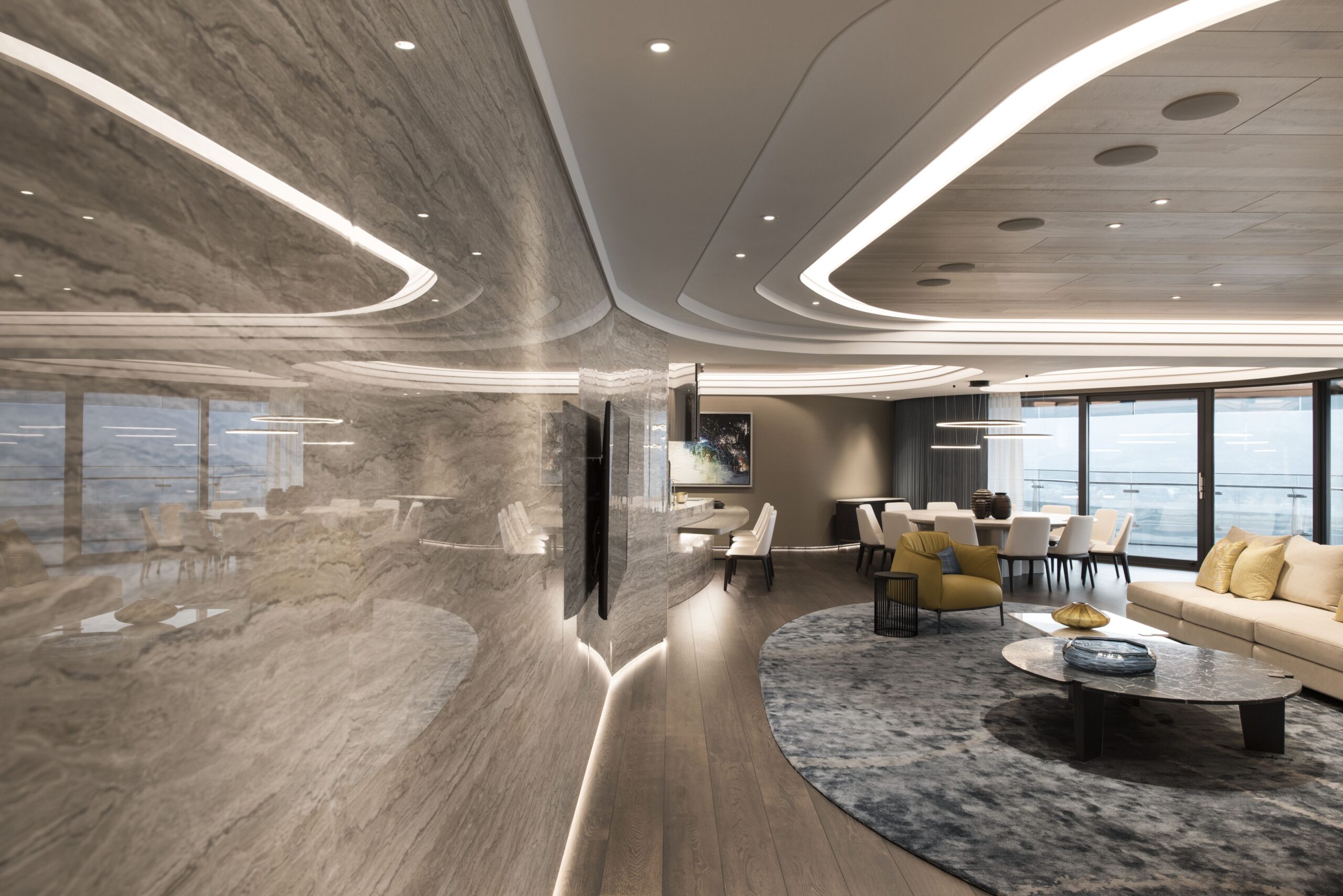 This opulent residence perfectly illustrates the creation of tailor-made solutions for spaces to fit client needs. An open plan layout facilities an effortless flow throughout the house and within this the living room seating arrangement offers breathtaking views across the sweeping landscape. There’s a separate multimedia entertainment zone and a study complete with large display cabinets. The dining area features a bar counter and large, round dining table that makes for the perfect entertainment area. There are hidden wine cabinets behind the bar counter and plenty of purpose-built storage throughout.