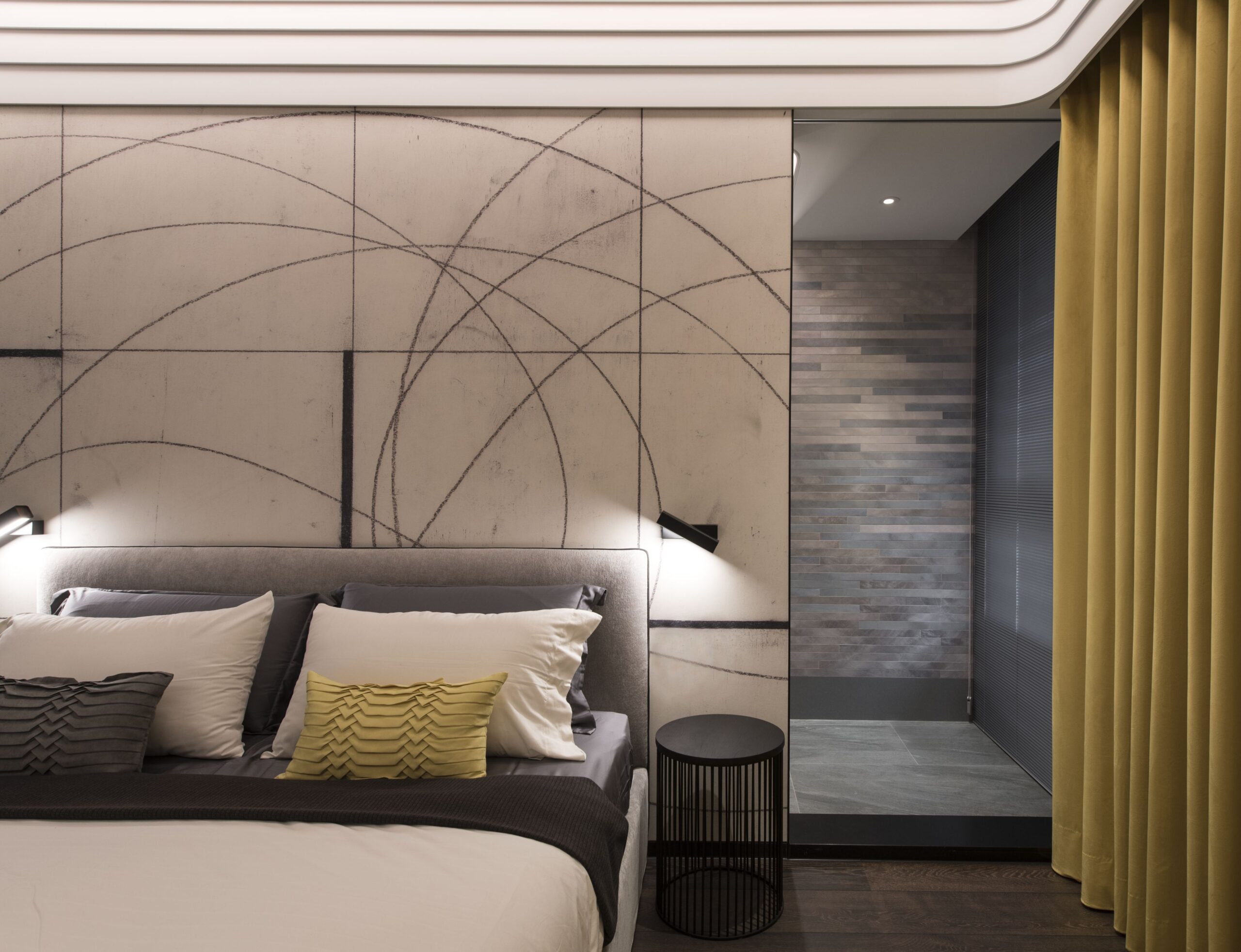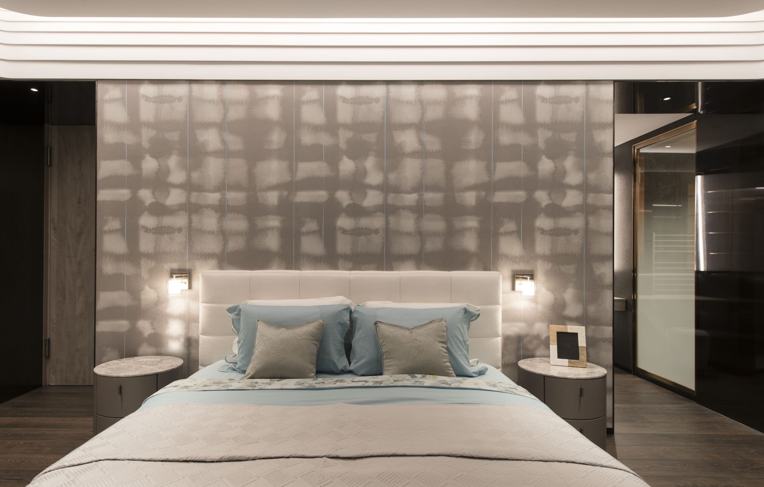 The three bedrooms are designed in modern urban style using linear decorative details as an extension of the free-flow design in the public space. And the luxury bathrooms showcase three different colored glazed tiles and opaque glass for the last word in smart contemporary style.