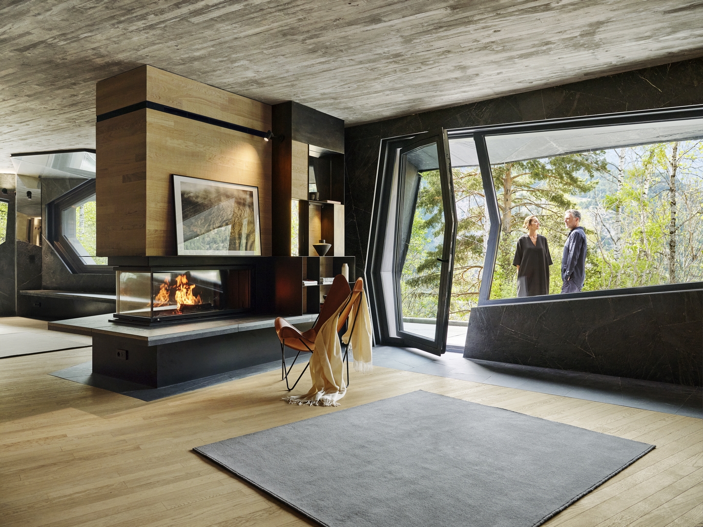 The project’s architecture and design have been carefully thought out to embrace the surrounding environment. Seven monolithic structures define the landscape, crafted from stone, wood, steel, and glass. The north façades with their wavy skins of slate slabs, glass openings, balconies, and covered terraces seamlessly blend with the granitic landscape in front, while the south façades, made of treated wood and glass, open into the lush forest, welcoming abundant natural light. The project is not just a residential development; it’s a symphony of design and nature where each element is designed to complement the other.