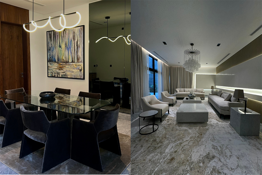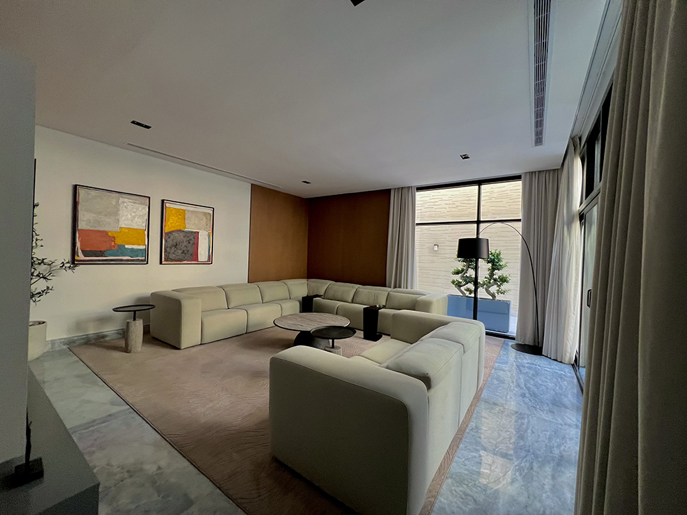 To furnish the Fakeeh Contemporary Home, Khaled Hashem selected pieces from high-end brands such as Minotti, Rugberry, Elegant Home, and Roche Bobois. The collaboration with these brands ensured that every piece of furniture complemented the home’s modern aesthetic. Additionally, the inclusion of artworks by local and European artists added a unique and personal touch to the space, elevating the home’s overall ambiance.
