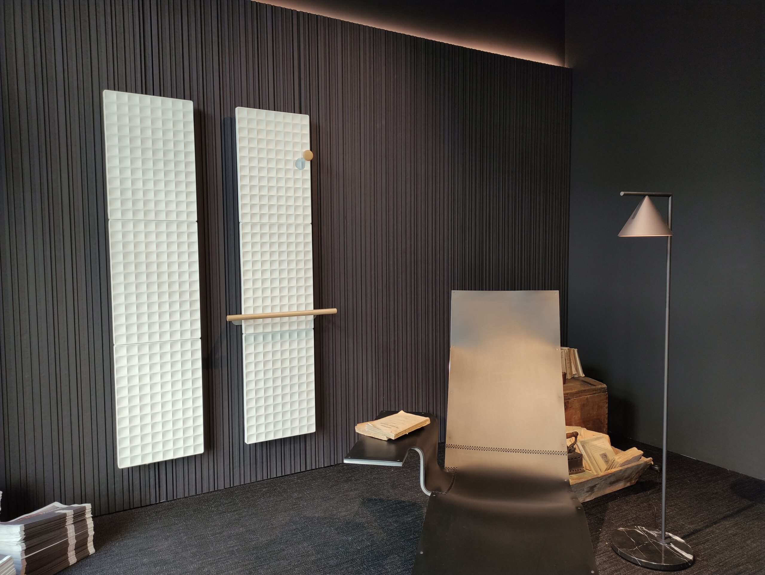 Le pareti dello showroom sono parzialmente rivestite da una boiserie in mdf molto caratterizzata che crea giochi di luci e ombre. Su di essa, sono protagoniste le più celebri collezioni di radiatori d’arredo dell’azienda, presentate sempre in banco o nero. Nella materioteca, invece, si spalancano le porte del colore (oltre duecento le tonalità disponibili per i radiatori), da sempre elemento fondamentale per Antrax, presente anche nel suo slogan “arancionedentro”, che racchiude l’idea di slancio creativo e non convenzionale verso un design fatto di ricerca e innovazione.
