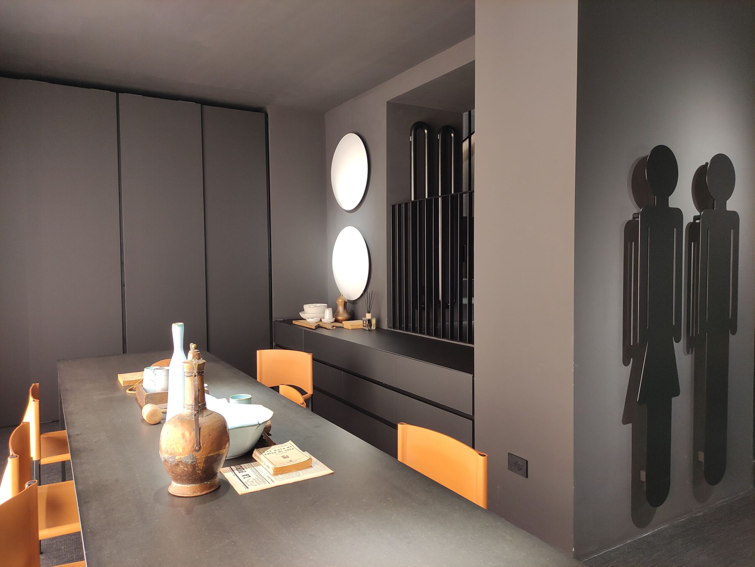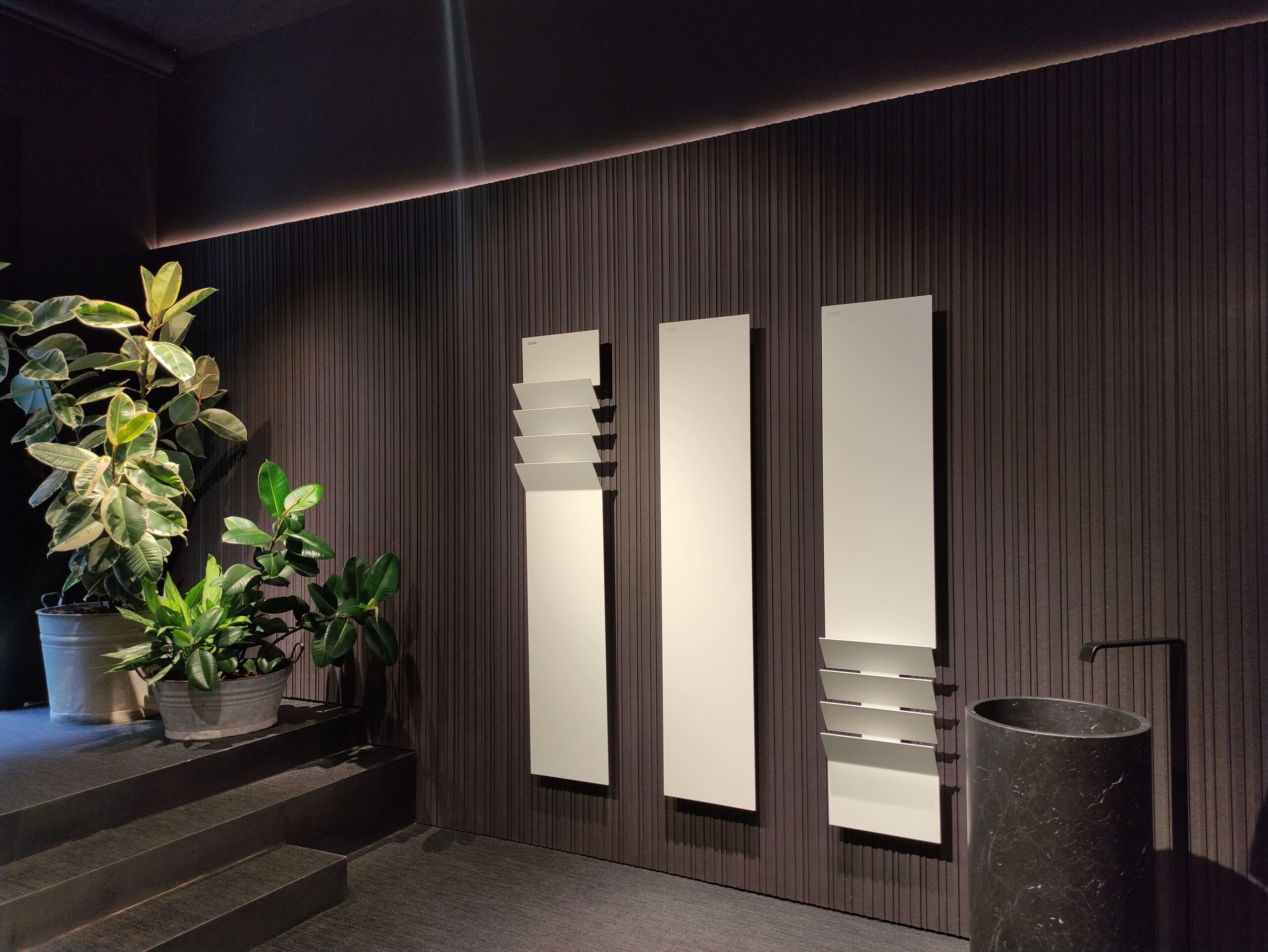 L’interno dello showroom è stato progettato da Victor Vasilev, già designer per Antrax IT del radiatore Flaps, che traduce in spazio l’estetica dell’azienda espressa negli ultimi mesi, fatta di atmosfere pure legate al bianco e al nero e geometrie essenziali. Ne risulta un involucro total black, organizzato su due livelli espositivi, che racchiude uno spazio quasi museale, dove i prodotti sono presentati lungo le pareti in modo da poter adattare lo showroom a vari ulteriori utilizzi. Un luogo flessibile ispirato ad una galleria d’arte contemporanea.