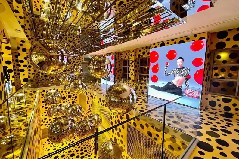 L’immaginazione dell’artista irrompe su pareti, pavimento, camerini e guardaroba, mentre dal maxi video in cima alla scala mobile lo sguardo della designer mi segue divertito mentre mi muovo tra arredi iconici del design, pezzi vintage del savoir faire italiano, oggetti dell’archivio storico di Louis Vuitton e opere d’arte esclusive. I pois ossessivi Infinity Dots dell’artista giapponese invadono ogni angolo, eppure il percorso tra pareti curve, angoli a tutta intimità e superfici riflettenti capaci di moltiplicare l’illusione dello spazio, rendono lo showroom avvolgente, quasi rassicurante.