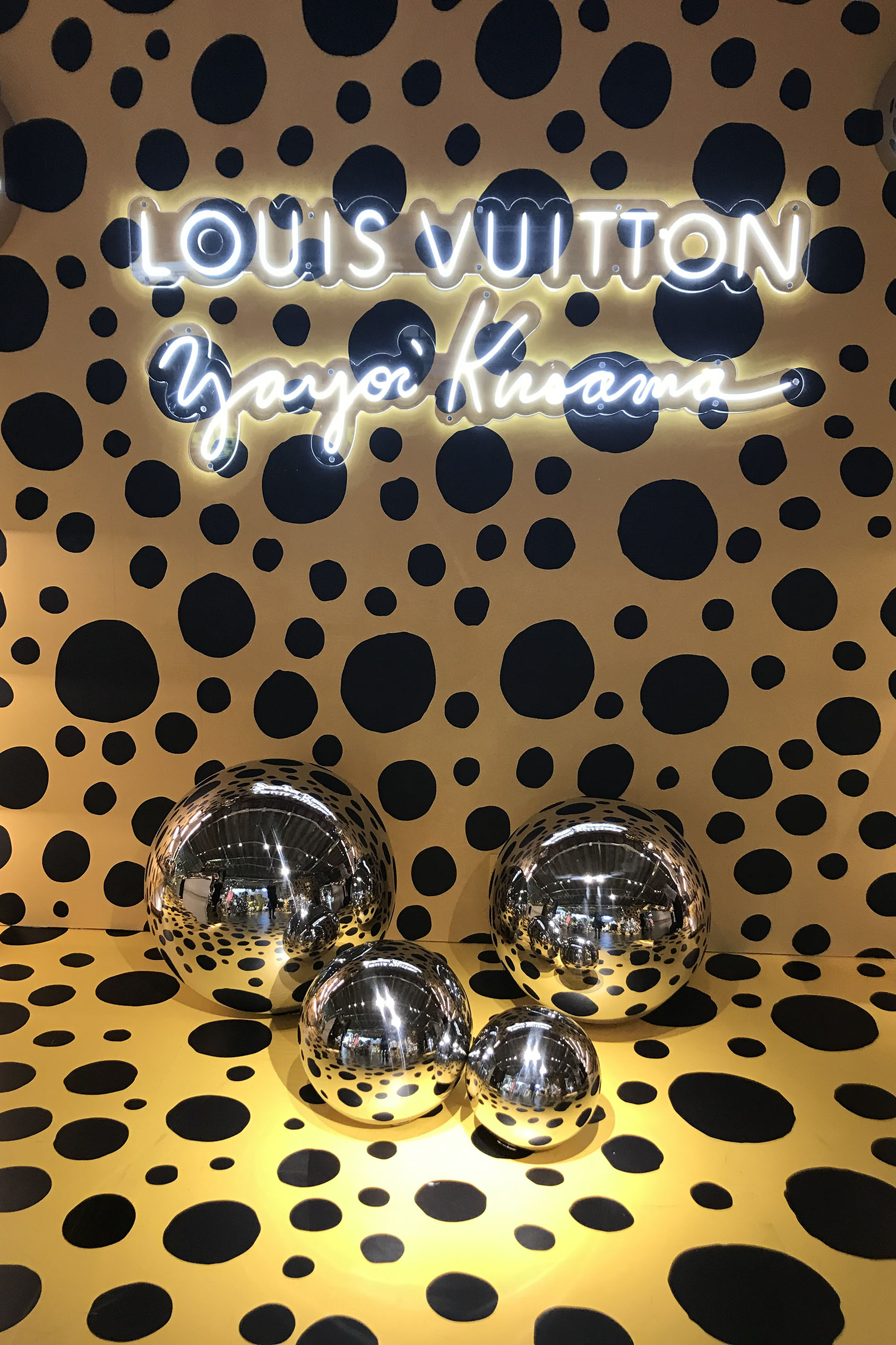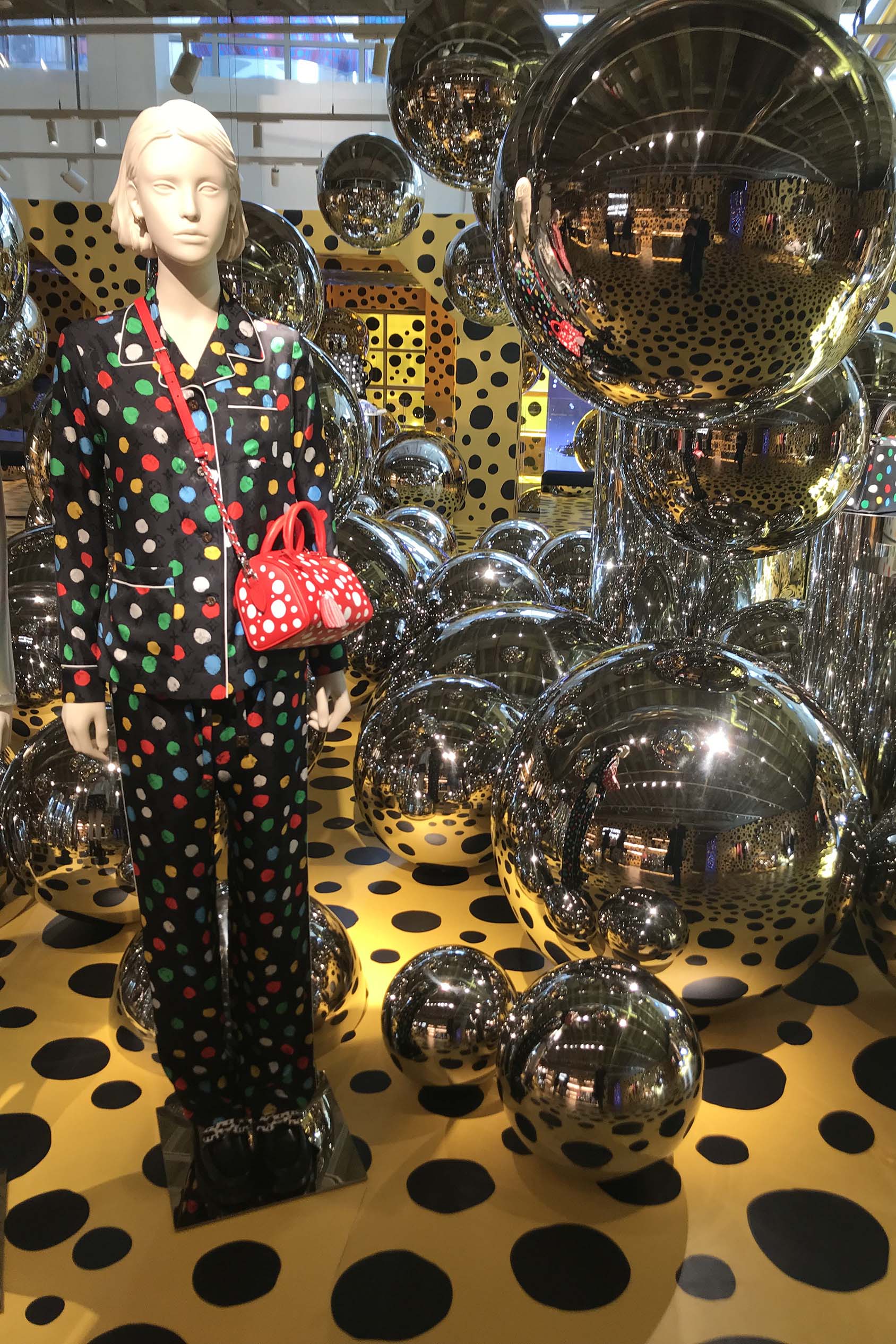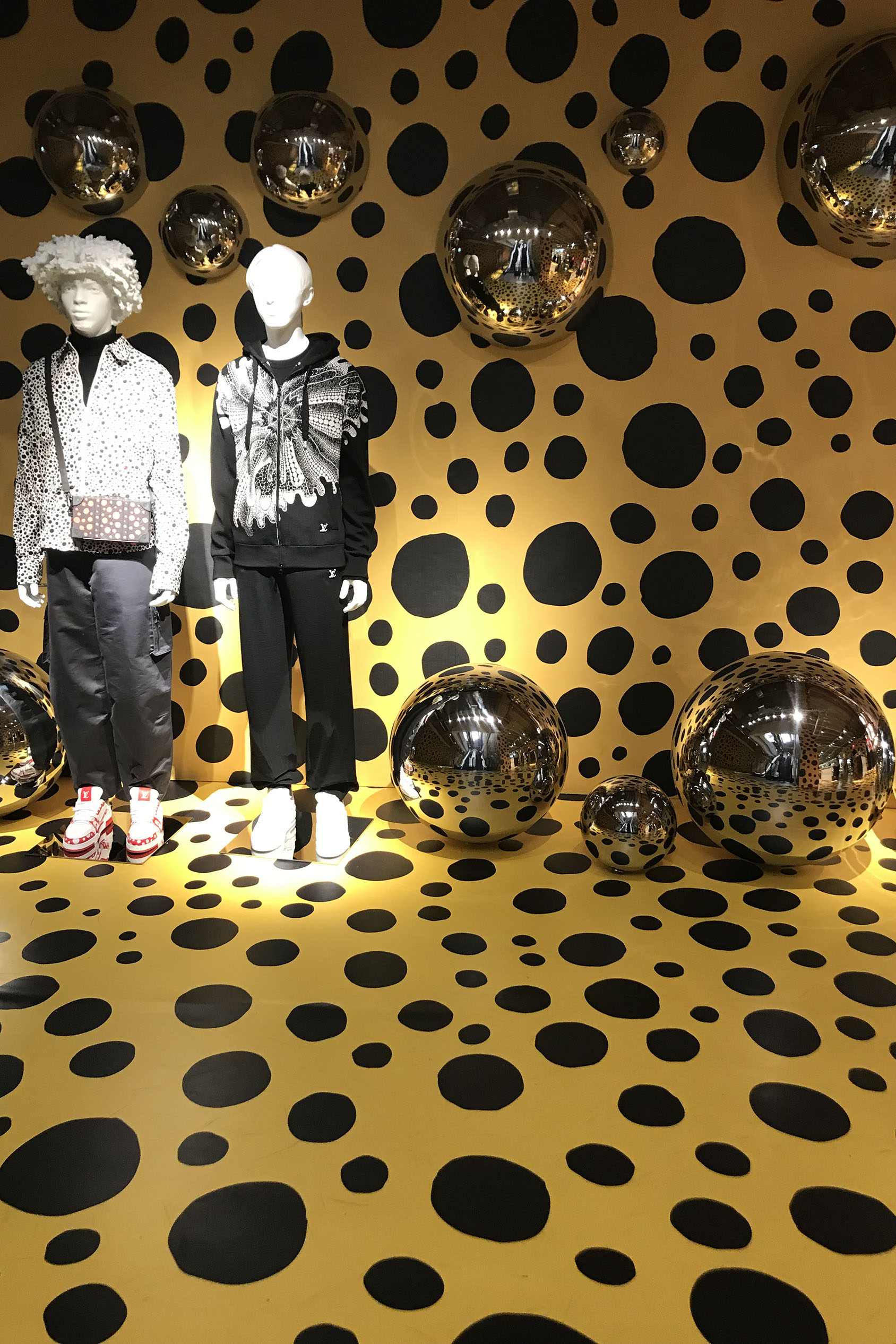 Il primo dei tre livelli (quello dedicato, appunto, ad ospitare i progetti speciali della maison francese), manda in scena i prodotti nati dalla collaborazione tra LV e Y. Kusama: borse, scarpe, fragranze, occhiali da sole, gioielli e abbigliamento femminile e maschile si riflettono nelle scenografiche boule argentate Metal Ball che troneggiano a grappoli su tutto il piano, mentre gli impertinenti pois irregolari si arrampicano sulle superfici nuovamente giallo sole e persino sulle giacche candide e sartoriali dei commessi.
