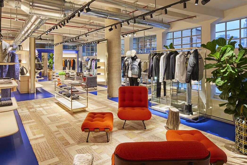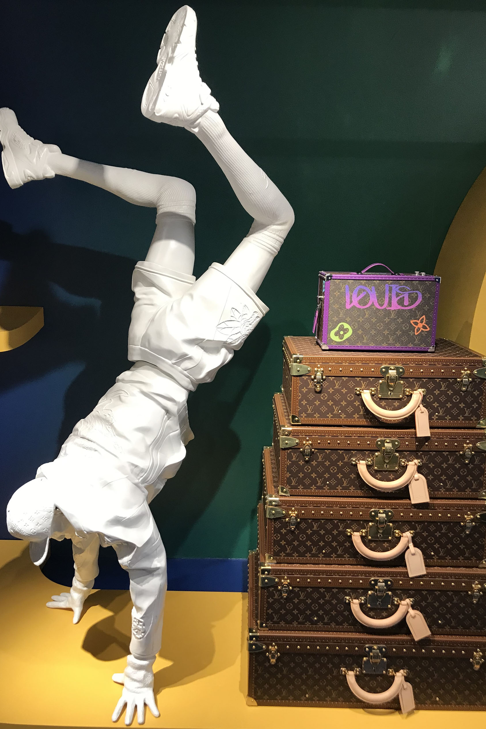 Salgo ancora di un piano, questa volta l’invito arriva da acrobatici atleti congelati in pose plastiche, che introducono lo spazio dedicato a “lui” dove domina un profondo blu klein. La vocazione artistica di questo spazio pop ci regala un’esperienza d’acquisto immersiva e sofisticata dove Louis Vuitton sembra rincorrere i leit motiv di Yayoi Kusama, mentre l’artista non fa altro che sottolineare lo stile unico della maison.